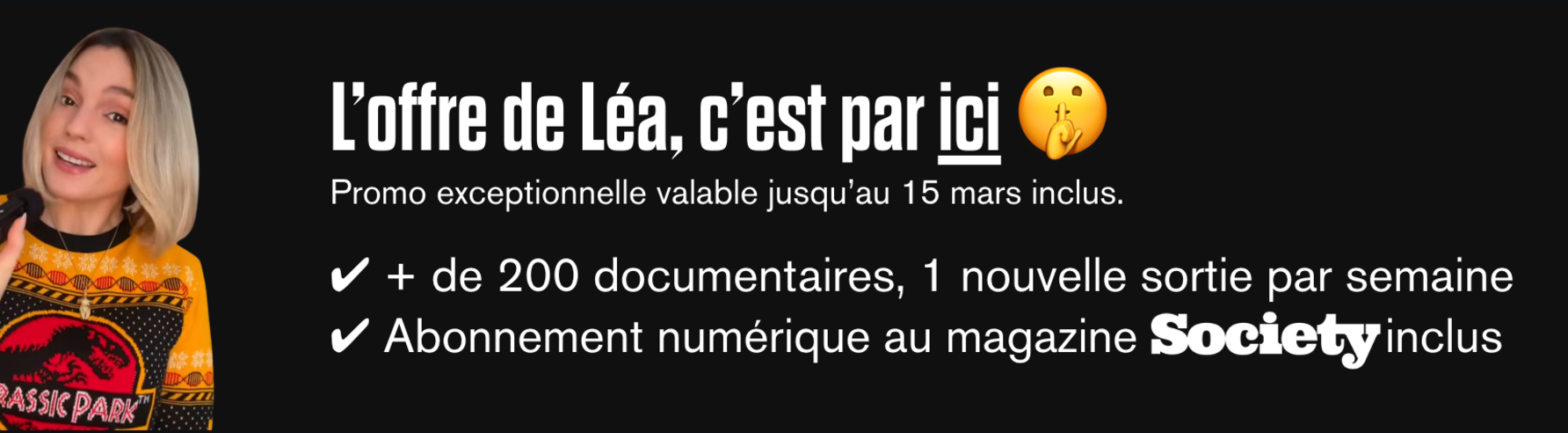 Explorez le catalogue Society+ sans abonnement ! Cliquez sur "Je découvre" sur la page d'accueil Society+ pour accéder à près de 200 documentaires.
